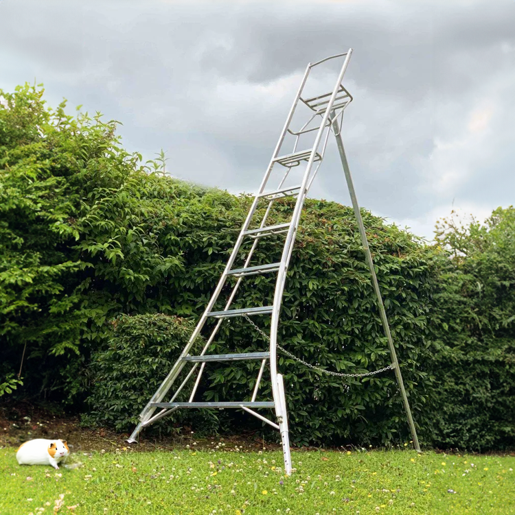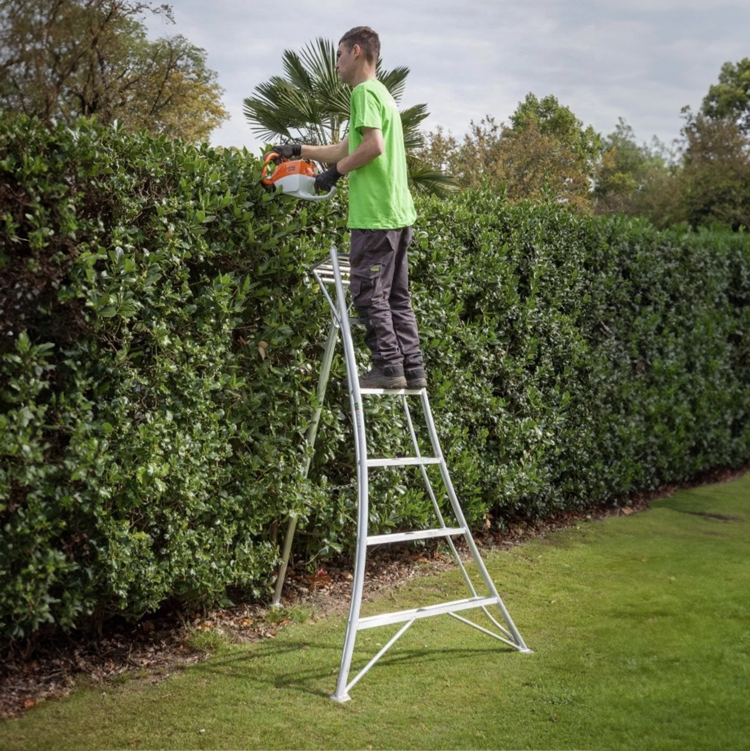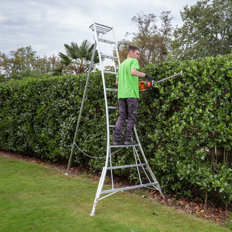 The sturdy tripod ladder boasts a stable design, complete with a platform for standing and a waist-high guardrail, ensuring safe work at heights. Perform tasks hands-free, maintaining at least three points of contact with the ladder, crucial for using gardening tools like shears and hedge trimmers.